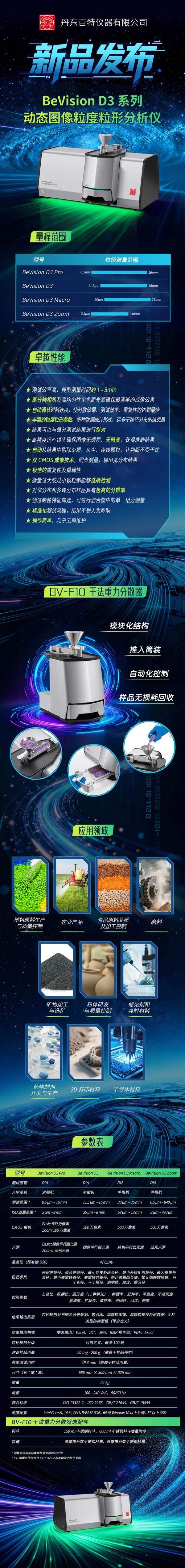丹东百特仪器有限公司全新推出BeVision D3系列动态图像粒度粒形分析仪,引领粒度粒形分析进入高效、精准新阶段!产品采用动态图像法原理,搭载BV-F10干法分散系...