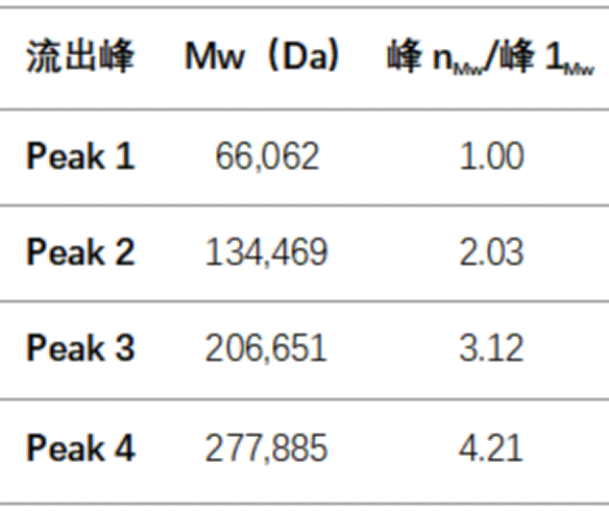 通过表1每个峰的分子量可以看出,峰1(最后的流出峰)的分子量为66K,这与BSA的理论分子量一致,峰2-4的分子量均为峰1的倍数,说明峰2-4分别为二聚体、三聚体和四聚体。