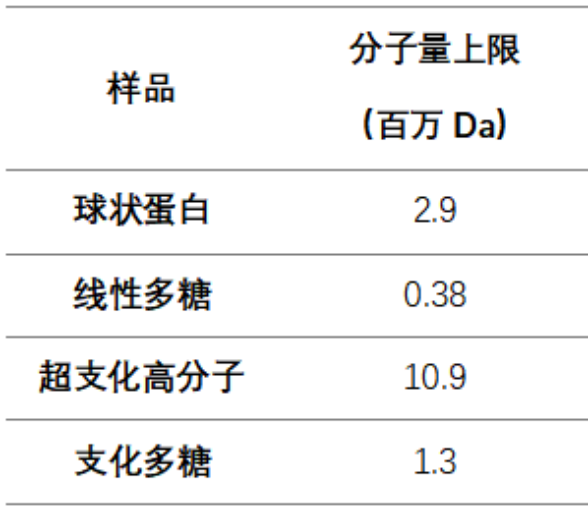 BeNano静态流动模式在90°使用PD检测器收集样品散射光强度信号,并同时收集示差折光检测器或者紫外检测器信号,结合这两个信号计算得到每个流出组分的绝对分子量和分子量分布信息。由于BeNaon采用的是单角度静态光散射,根据瑞利散射理论,只要分子大小不超过波长1/40,结果的准确性都能够得到保证,这尤其适合蛋白质类样品的检测。BeNano对于不同种类样品的准确检测上限如下表: