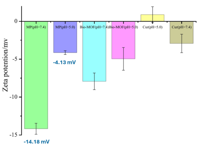 为验证姜黄素(Cur)配体在低pH条件下的释放是否与Bio-MOF表面的多巴胺(PDA)包覆层剥离有关,研究人员检测了Bio-MOF和MP纳米粒子在不同pH下的Zeta电位变化,结果见图2。