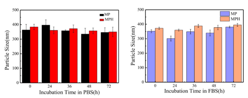 除了Zeta电位,粒径的表征同样重要。该研究为评估MP和MPH纳米粒子的体外稳定性,将样品分别置于PBS(pH 7.4)溶液和FBS培养基中模拟生理与血浆环境,并记录其在不同时间下的粒径变化。