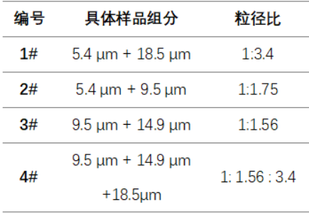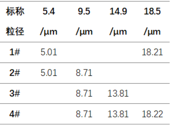 实验采用已知粒径的多个PMMA球进行,PMMA球粒径分别为5.4μm、9.5μm、14.9μm和18.5μm,将样品混合配置成混合液,混合的具体信息如下:
