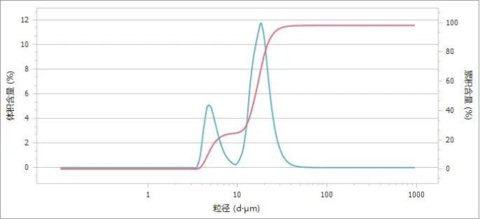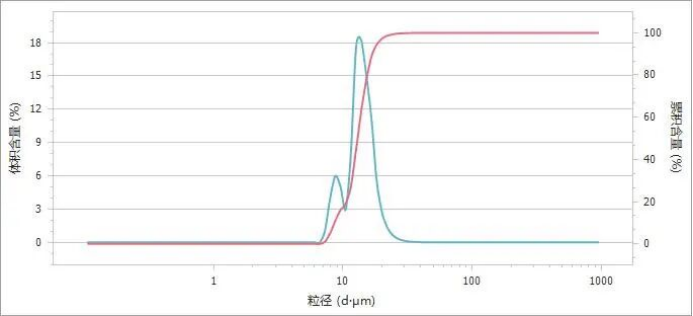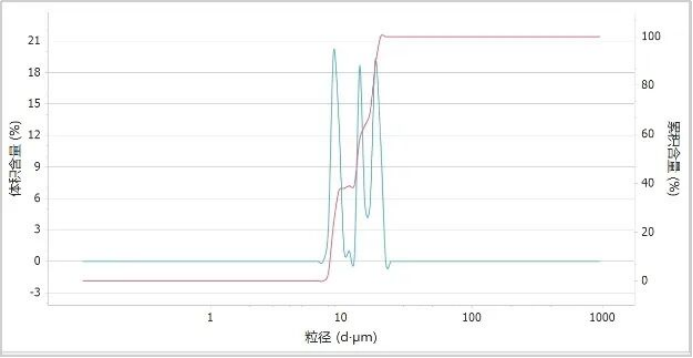 图3. 10μm+15μm样品沉降法信号(上图)和沉降法粒度分布(下图)