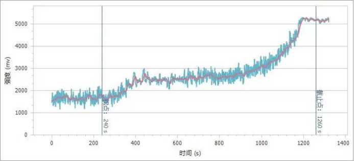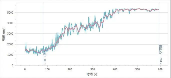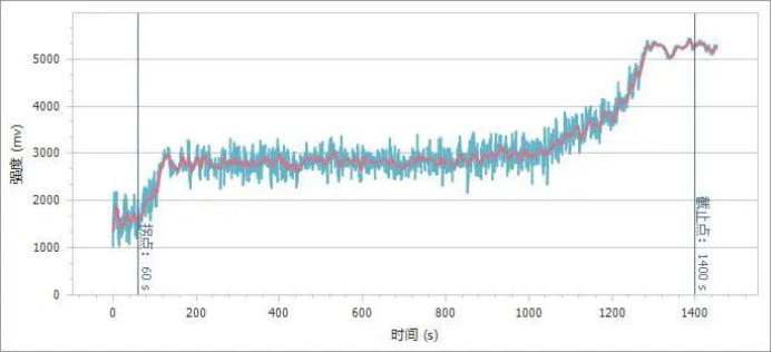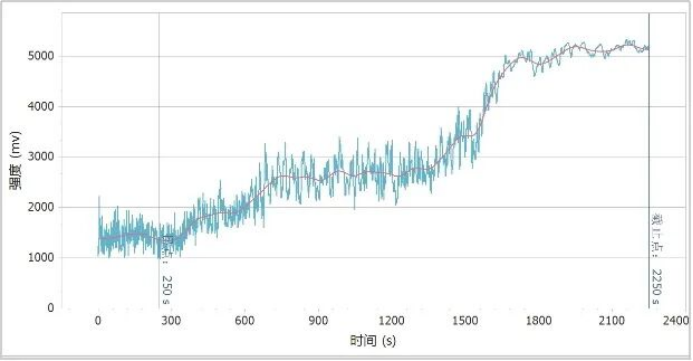 通过图1-4的沉降信号和对应的粒径分布曲线可以看出,若两个粒径的样品混合,其沉降原始信号中有两个上升平台;若三个粒径的样品混合,其沉降原始信号中有三个上升平台信号。