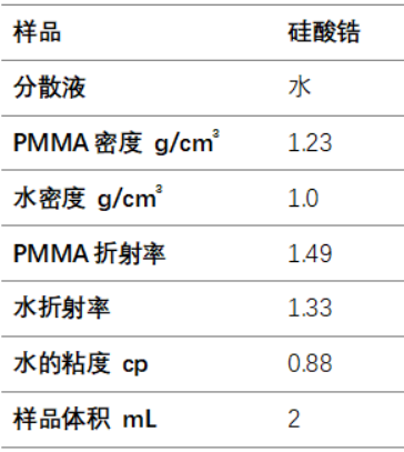 计算体系的粒径和粒径分布信息,测试需要对应温度下分散介质的折射率、密度和粘度,对应温度下颗粒物的折射率和密度,以及样品体积。