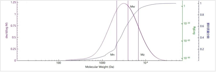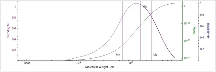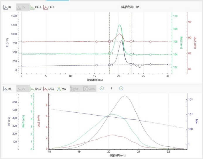 BeSEC工作站软件收集光散射信号与前端GPC的示差或者紫外信号,通过BeSEC工作站软件计算得到分子量分布和平均分子量Mn、Mw、Mz的信息。
