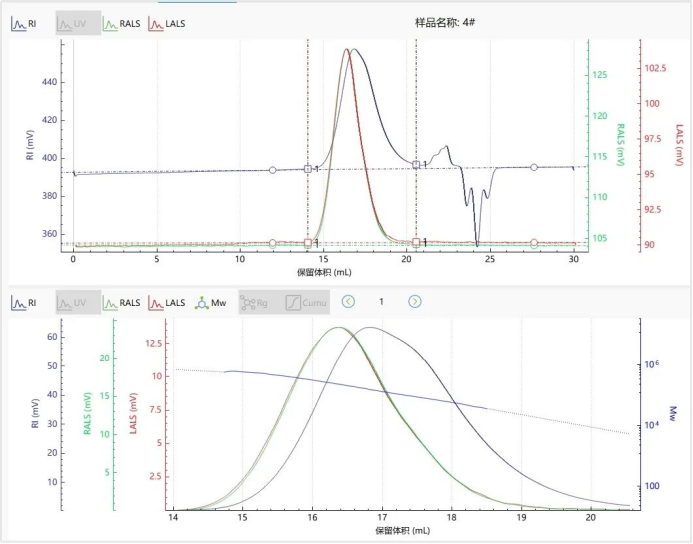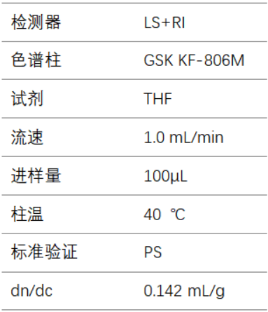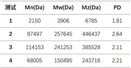 通过图1-图4可以看出,色谱曲线信号质量良好,基线平整没有明显漂移或者较高噪音,光散射和RI信号均具有较好的信噪比。其中分子量流出曲线显示,分子量随流出体积逐渐降低。光散射信号没有拖尾,且分子量曲线没有翘尾,说明色谱柱对于样品中不同尺寸的分子做出了有效分离,大分子先流出,小分子后流出。检测结果列于下表中: