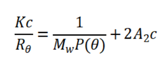 其中c为样品的浓度,θ为测量的角度,Rθ 为θ角方向的瑞利散射比,Mw 为分子量,A2 为第二维利系数,K为与(dn/dc)2相关的常数,P(θ)为结构因子。