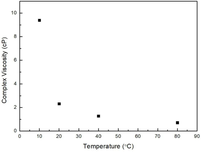 在图4复数粘度对温度的曲线中,取频率为870rad/s的复数粘度对温度作图,结果展示在图5中。从图中可以看出,随温度升高粘度迅速降低,且转变点与文献中报道的25-35℃之间吻合度较好。