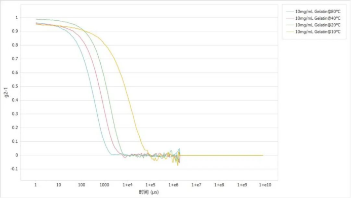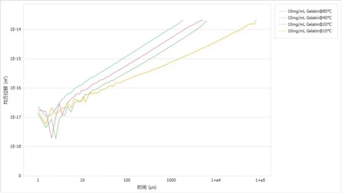 通过BeNano内置的温度控制系统将测试温度控制为10℃、20℃、40℃和80℃,并在此温度下进行了动态光散射微流变测试。