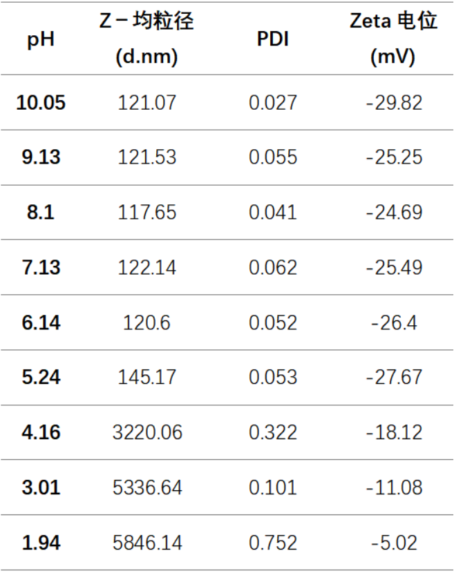 通过图2曲线可以看出,在滴定的pH范围(pH=2-10)内样品的Zeta电位都呈现负值,说明颗粒表面携带负电荷。样品的Zeta电位在pH大于6的范围内,其幅值在-25mV至-30mV范围内波动,粒径在120nm附近,通过表1中PDI数值可以看到在此范围内PDI较低,说明样品均匀性较好;当样品的pH低于5,其电位幅值随pH降低显著下降,在pH=2时Zeta电位降至-5mV。随着Zeta电位降低,颗粒间相互作用力减小,体系生成团聚物的倾向越来越大,粒径逐渐增大。通过图3的粒径分布信息可以看出随着pH降低,粒径分布逐渐向大尺寸方向偏移。