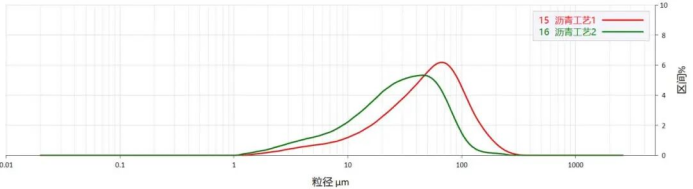 在生产中,不同工艺下沥青的粒度分布相差很大,如图3所示。我们分析了两种工艺条件下沥青的粒度分布,如图4所示。可见,百特激光粒度仪能准确测出不同工艺条件下沥青的粒度分布,为优化工艺参数提供依据。