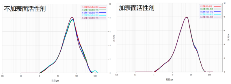 合适的分散方法是粒度检测中的重要一环。本实验用水做分散介质测某型号沥青粒度,然后在水中加表面活性剂为分散剂,外加超声分散测同一个型号沥青的粒度,如图3和表1所示,可以看出,水中加表面活性剂再超声分散2min沥青分散效果最佳,粒度最稳定。