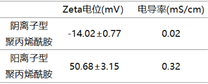 通过对两个携带不同电荷的聚丙烯酰胺样品进行测试,发现其电位符号与其标注的阳离子和阴离子相对应。测试结果重复性较好,电位幅值具有较大差别,可能与其电荷密度不相关。